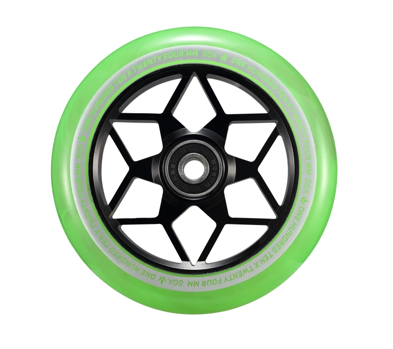 These custom scooter wheels measure in at 110mm x 24mm wide with tough 86A Polyurethane Includes ABEC 9 BearingsÂ