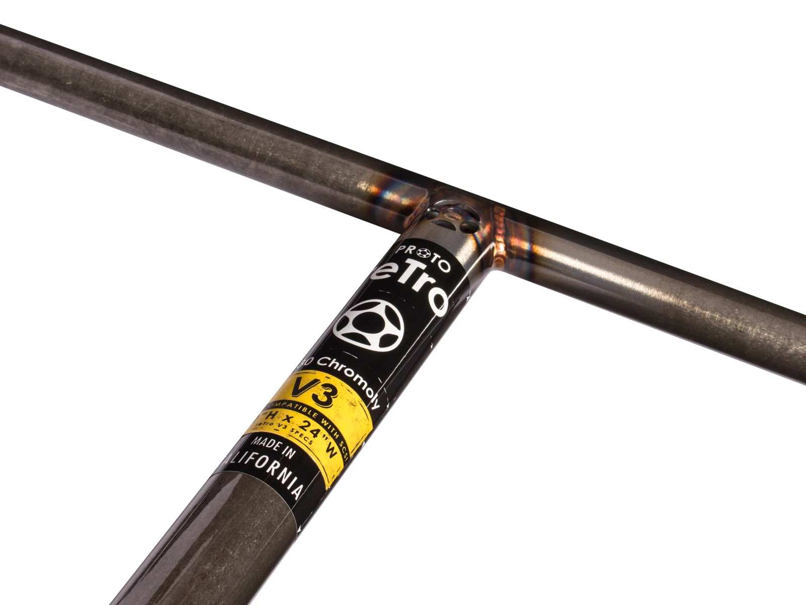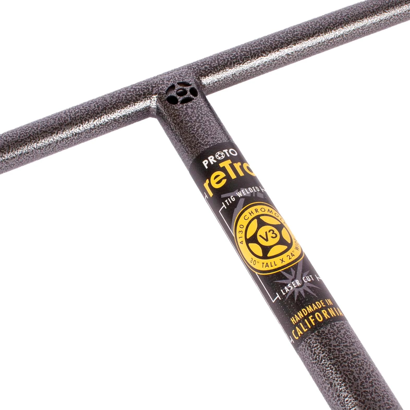 PROTO reTro Lites V3 handlebars come in at 30″ tall x 24″ wide, making it one of the largest “T” bars in the industry. Not only did the PROTO retro V3 increase substantially in width and height from the V2, it also increased the thickness of the 4130 chromoly tubing used for the crossbar and the steering column to increase strength. These reTro’s come with a flat black powder coat. Complete with a laser cut PROTO logo. ATTENTION: SCS COMPATIBLE ONLY!