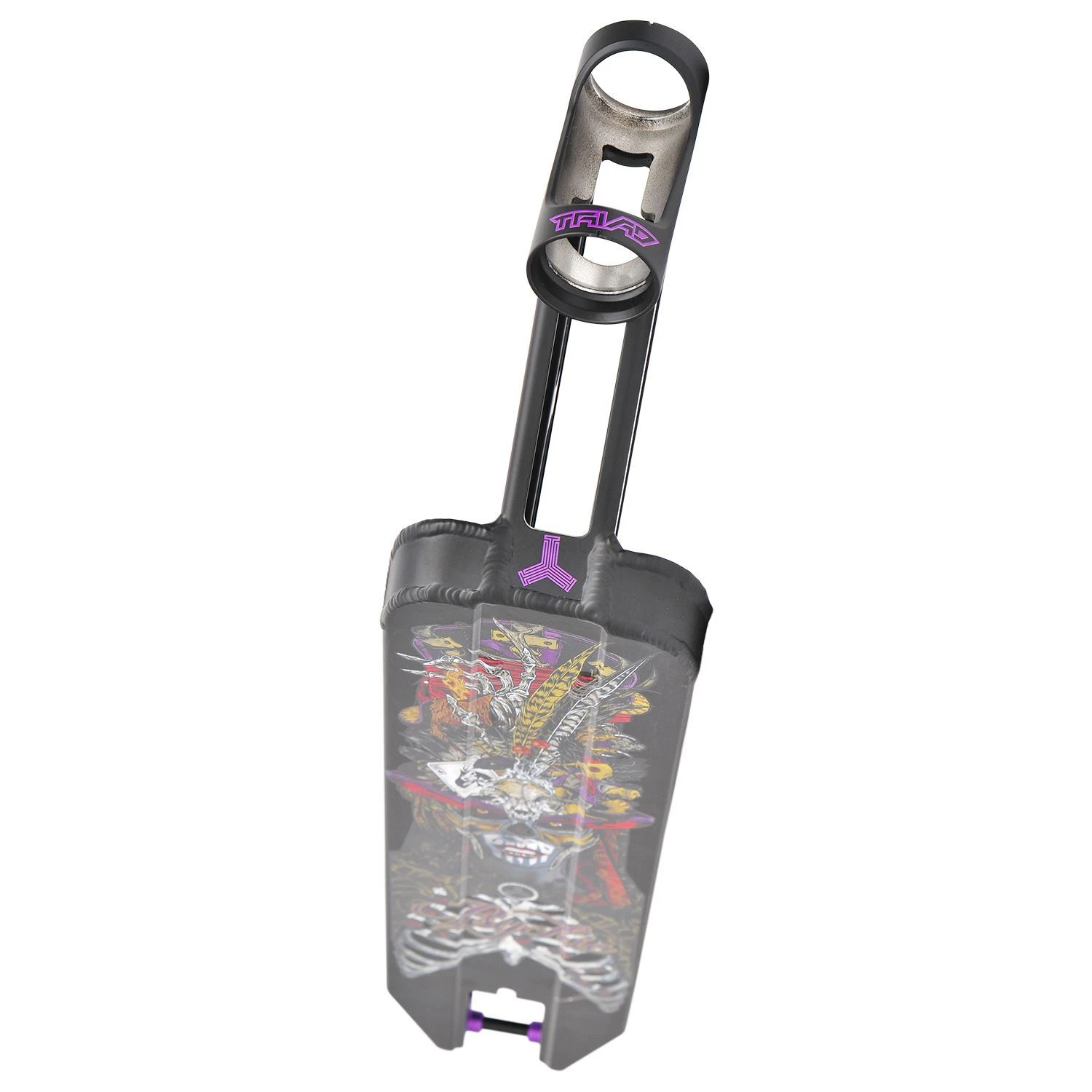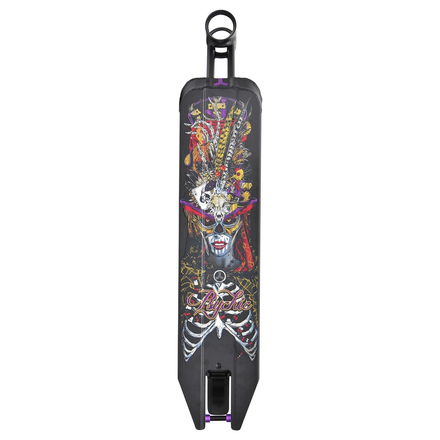 Our new Psychic deck was styled from our original Medusa deck but significantly refined to reduce weight and improve function. Featuring the new V2 Fend Off brake system, lightweight but strong neck and head tubes. KEY FEATURES 7 Series Aluminium gives a higher resistance to dings and bending. Lightweight extruded and CNC’d neck tube designed for maximum foot room, saving 200g on the Medusa deck. Choose a brake or fender with our exclusive V2 Triad Fend Off 2-in-1 brake and fender system. Gridlock Axles system enables simple access for maintenance and wheel change-outs. New 5.0 deck inserts on the boxed versions broaden the balance point zone proving increased stability. 83 Degree head tube angle. Integrated headset cups. Clear Cast grip tape lets the deck shine in all it’s glory. Exclusive hand-drawn psychic witch graphics Comes in 5 sizes: Deck Size: 19.5″ x 4.7″/ 495mm x 120mm , Weight: 45.15oz/1.28kg Deck Size: 20.5″ x 4.7″/ 520mm x 120mm, Weight: 46.9oz/1.33kg Deck Size: 22″ x 5.1″/ 560mm x 130mm, Weight: 52.9oz/1.5kg Deck Size: 22″ x 5.5″/ 560mm x 140mm, Weight: 57.84oz/1.64kg Deck Size: 23″ x 5.5″/ 585mm x 140mm, Weight: 58.2oz/1.65kg MSRP Deck Size: 19.5″ x 4.7″ and 20.5″ x 4.7″ – $159.95 Deck Size: 22″ x 5.1″ – $189.95 Deck Size: 22″ x 5.5″ and 23″ x 5.5″ – $199.95 Â SKU: 5314-VBK What’s in the Box? 53141 :: 1 scooter deck with grip tape || 53147 :: 1 scooter deck with grip tape || 53153 :: 1 scooter deck with grip tape || 53156 :: 1 scooter deck with grip tape || 53158 :: 1 scooter deck with grip tape