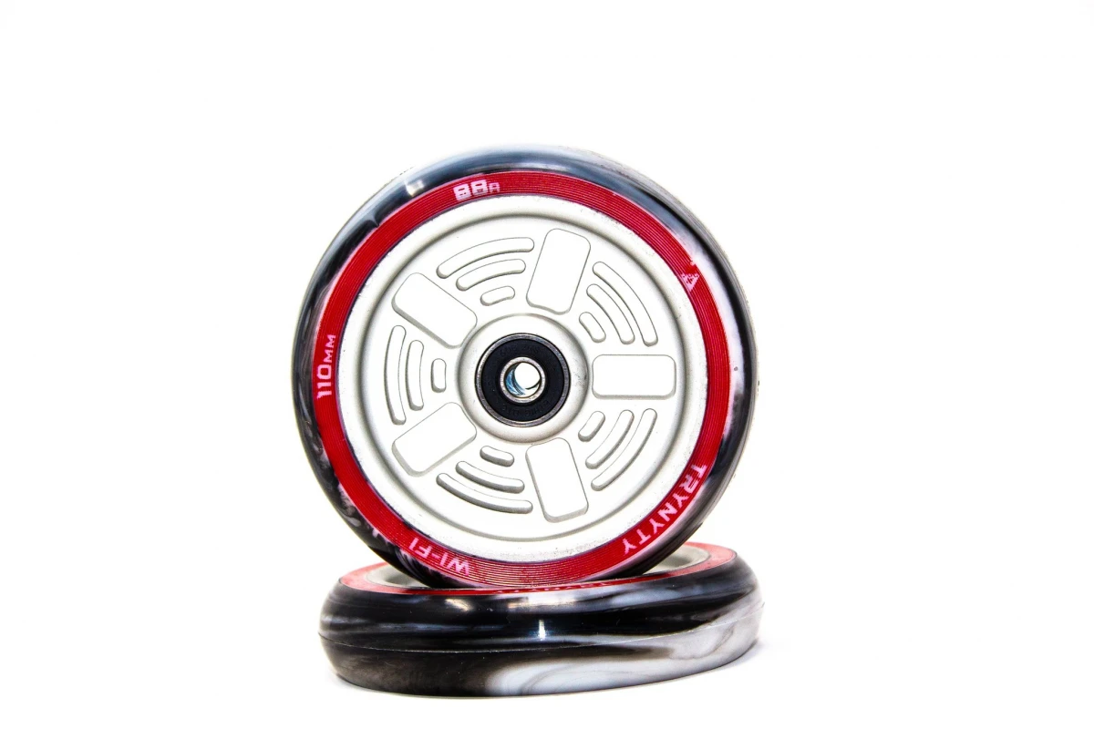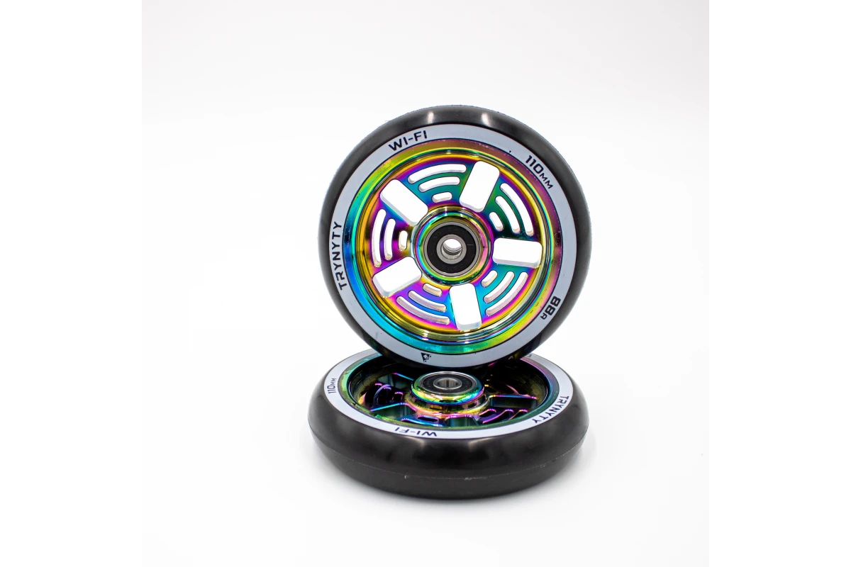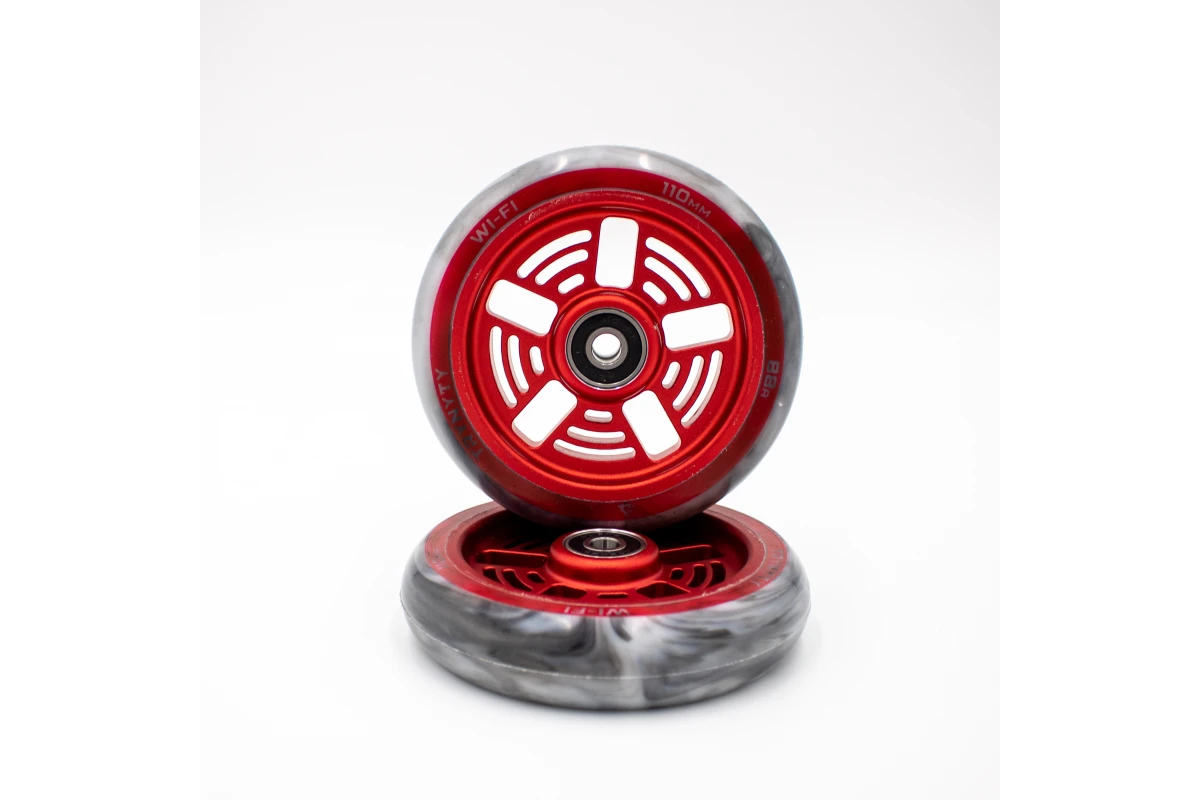 Our brand new Wi-Fi wheels are a 110mm 88a 24mm wide wheel. The Silver and Black cores feature a swirl PU and the oil slick cores features a classic black PU.